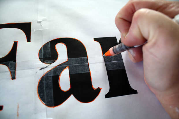 Deslizar su hoja de papel carbón o grafito entre la Junta Directiva y la plantilla y comenzar a remontar alrededor de los bordes de cada letra con el bolígrafo.  Su papel de transferencia probablemente no cubre toda la longitud de la Junta, por lo que tendrá que a lo largo de deslizarse marcha.  Usé una pluma naranja al rastro para que fácilmente pude ver donde dejó.
