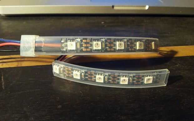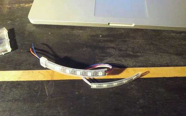 Un acuerdo "progresista" de LEDs se suelda continuamente. Cortar la tira de LED en dos piezas y soldar los cables directamente entre las dos piezas. Si quieres convertir éstos en una matriz, debe girar la segunda pieza de tira, así terminan los cables detrás de los LEDs. Ver las fotos para ver ejemplos.