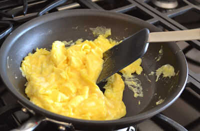 4. Levante la cacerola de la estufa y seguir removiendo los huevos hasta que estén cocidas las piezas crudas.