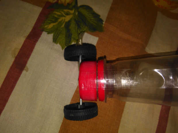 Sujete las ruedas delanteras en la tapa de la botella como se muestra en la imagen de arriba.