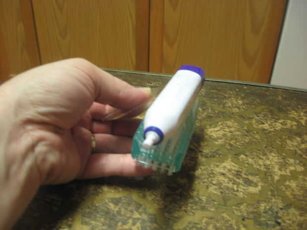 Ahora necesitas un trozo de cinta que dará comienzo a un lado del cepillo de uñas, ir todo el camino sobre el cuerpo de cepillo de dientes y luego terminar en el otro lado de la escobilla de uñas. Puede hacer un mejor cálculo y recorte con tijeras o se puede medir para ver cuánto de una pieza que necesita. También quisiera hacer un pequeño doblez en el extremo así que fácilmente puedo quitar la cinta si desea o necesita.