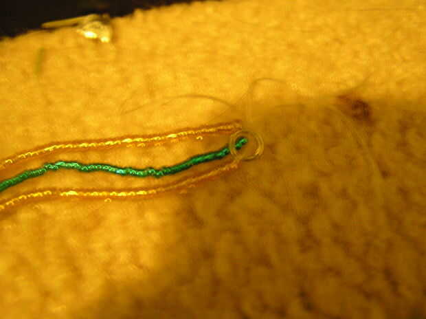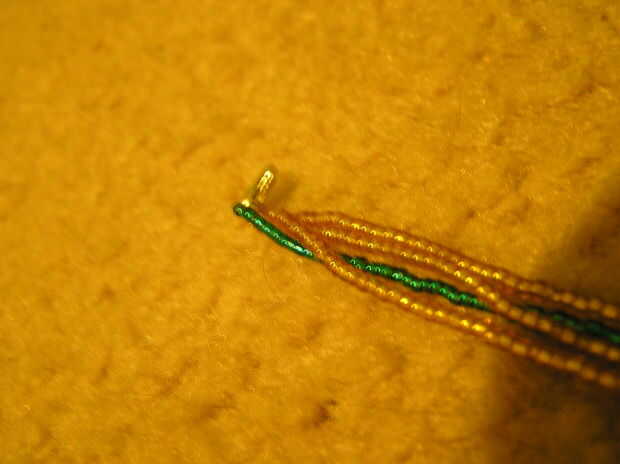 Ahora toma una cadena y conecte la aguja pequeña y empezar a ensartar perlas en. Una vez que se ha llegado a su marca de 4 pulgadas tomar el último grano en el filamento y un nudo alrededor de él. Repita para el resto de los filamentos.