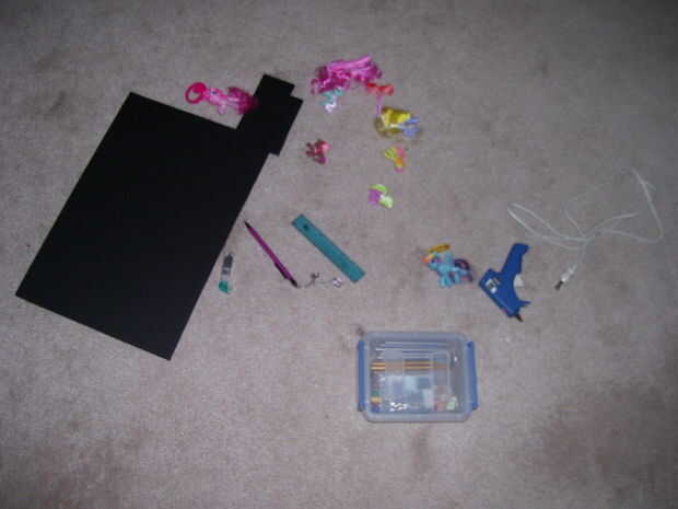 yo sabía lo que necesitaba para el estante: tenía que ser lo suficientemente grande para mi modesta pero lentamente creciente colección, bastante simple para repetirse si dijo colección pasa la primera bandeja y lo suficientemente adaptable como para que pudiera averiguar cómo agregar un gancho para otro próximo instructable, una barra para ponis de D Micky y un lugar para las tarjetas que vienen con los ponis de bolsa ciega. Lamentablemente eso es acerca de como sabia planificación por proyectos como este artista espontáneo tipo, watcha va a hacer? - así que comencé a cortar y clase de ran y una pistola de pegamento caliente.