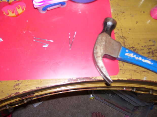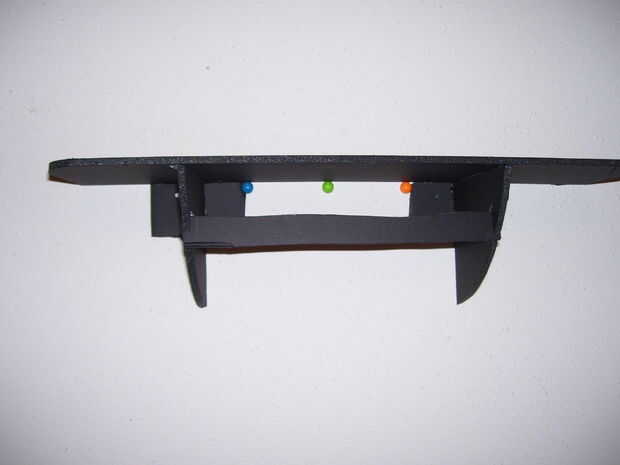 Tiempo para colgar la cosa! Originalmente quería a las chinchetas por todo el apoyo, pero estaban demasiado cortos; Me conformé con dos clavos y chinchetas bajo los bits tambaleantes; después de todo es tablero barato-núcleo de espuma.