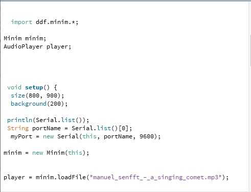 El código que vamos a manipular con Serial llamada respuesta encontramos de Processing.org y se llama gradiente de la onda. También vamos a cargar un sonido en el código. He usado el archivo MP3 de la "canción" hecha por el cometa Rosetta y han subido aquí, pero usted puede usar lo que quieras. Para asegurarse de que los juegos de MP3, asegúrese de depositar el archivo MP3 en el archivo de proceso que están trabajando.