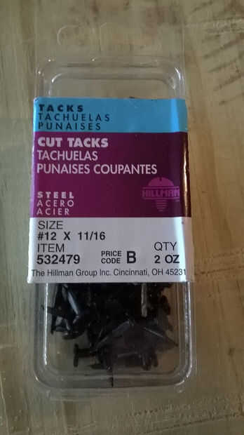 Estas tachuelas corte son perfectos para el cortador. Son sólo la longitud adecuada y son difíciles de mantener una buena ventaja. Usé un 1/16 de pulgada broca para perforar al piloto. Un agujero más grande puede hacer que el clavo aflojar para arriba finalmente. Podría llegar lejos sin este agujero Si utilizas pino y Álamo dividirá seguramente. Es mejor lo jugar a seguro.