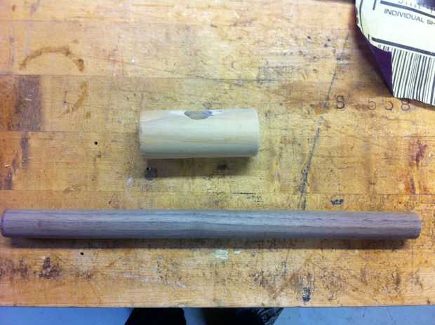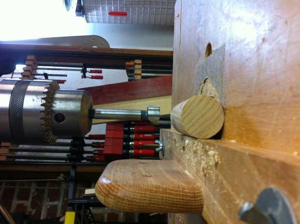 1 obtener la espiga corta para usar como la cabeza. Poner en el soporte para el taladro y alinee por lo que se haga a través del centro. Se puede medir, pero he decidido no. Luego perfore a través de la pieza.