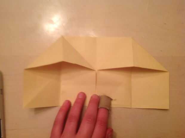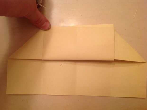 Cerrar la aleta del centro. Arruga bien. Luego, doblar hacia abajo hasta la mitad. Doblez.