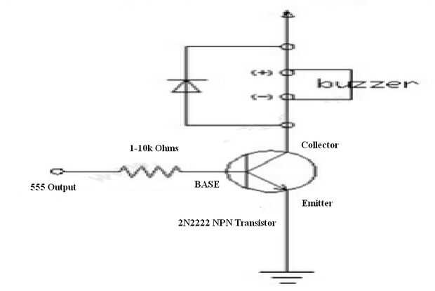 El zumbador piezo es un zumbador "activo". ZUMBADORES muchos requieren un una frecuencia aplicada dentro de la gama de audio funciona correctamente. ZUMBADORES activadas simplemente necesitan una fuente de alimentación que se agregará, como hay un circuito de oscilador interno de ese poder hasta cuando se aplican 5v. El transistor driver actos para completar el circuito cuando se aplica energía de la salida del Temporizador 555 a la base del transistor a través de un resistor de protección. Si esto sucede, corriente de colector del transistor puede fluir a través de al emisor, que está conectado a la línea de tierra. Si usted mira el vídeo a continuación, se explicará en su totalidad.