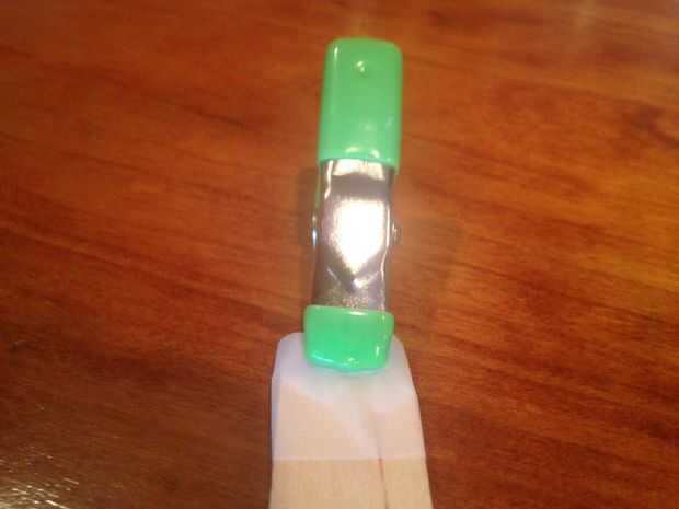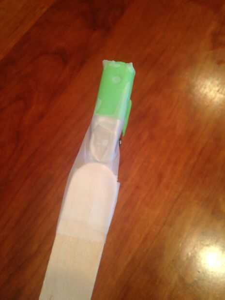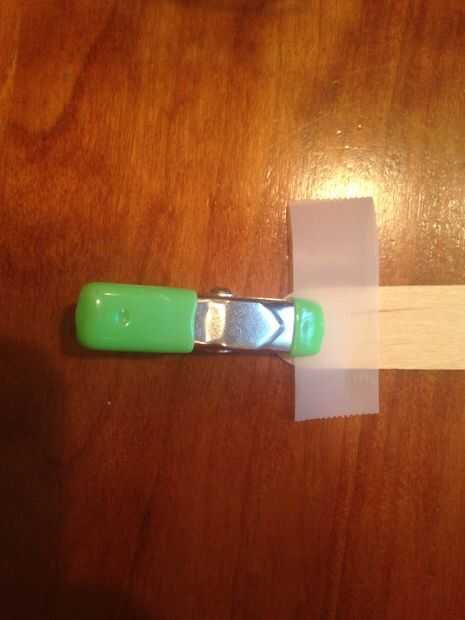 a continuación, necesitará su clip pinza de ropa o comida al otros extremo del palo de la cinta. Hacen sobresalir del palillo hasta y robusto como sea posible, como se ve en las fotos. No queremos que caiga! También, utilice tanta cinta como te gustaría.