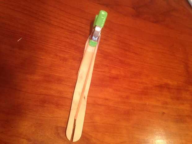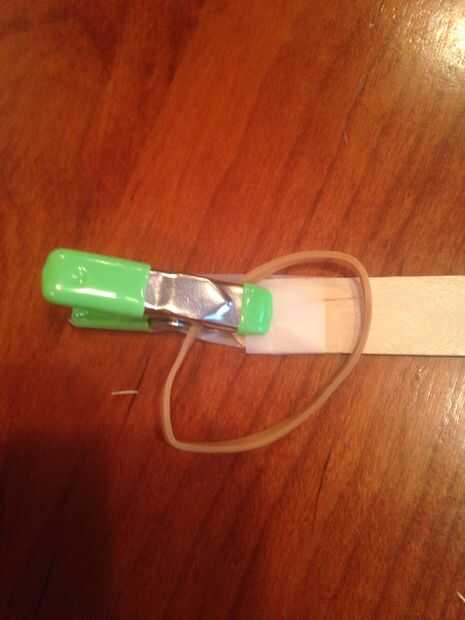 Tome el rubber band(s), poner en el clip y estirar al guión que hiciste en el paso 1. Objetivo, abrir el clip y ver que volar! Si el guión es demasiado largo, que sea más corto y vuelva a intentarlo.