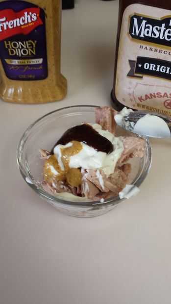 Mayo Añadir (o salsa tártara si prefieres) y cualquier otro ingrediente que te pueden gustar. Con mayo justo el bocadillo será llano. Generalmente añadir un poco de salsa BBQ, mostaza de dijon y un poco de salsa de miel. Otras personas les gusta agregar apio picado, cebolla o cualquier cosa que encuentra en su refrigerador. Experimento!
