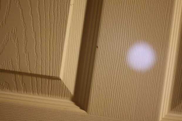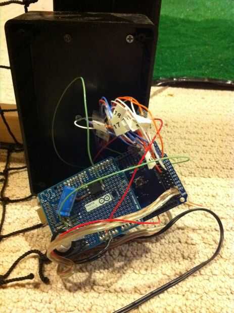La segunda imagen de abajo es de perforar los orificios de sensor/emisor de la prensa del taladro. La tercera foto es una prueba aproximada de hice - puse una linterna detrás de la Junta de unos 3' de la puerta (la superficie limpia blanca que pude encontrar en mi tienda) para probar el ancho y la dispersión del haz colimado. La última foto es de la caja de control abierta, mostrando el arduino montado al lado de los meta-lotes terminados de cables! Observe cómo tengo cada uno de ellos numerados para la conexión el pin correcto.