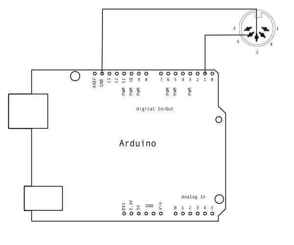Como dijimos al principio, necesitamos un instrumento con interfaz MIDI para generar las notas. El conector MIDI tiene 5 pernos, pero se utilizan sólo 3: GND, VCC y datos. VCC no es necesaria, así que sólo tenemos que conectar a GND y los datos a la placa Arduino.