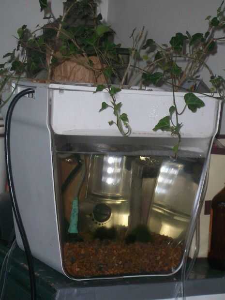 Había comprado un sistema de acuaponia denominado «Aquafarm» de 'Vuelta a las raíces' hace mucho tiempo. Se rompió cuando un pez se quedó atascado en el tubo en el centro del tanque que empuja el agua hasta que un pez quedó atrapado en el tubo. Mató a los peces, el difusor, la bomba y todas las plantas.