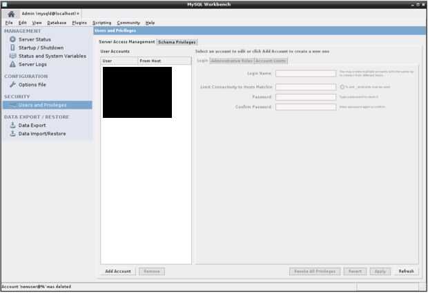 De forma predeterminada, el servidor es set hasta las conexiones de acceso se realizan en la máquina, es decir modo de localhost. Para poder llevar a cabo, en lugar de la inserción o el seleccionar remotamente, también crear una nueva cuenta, con la posibilidad de encender incluso fuera del dispositivo. Para ello, abra el menú de Workbench frambuesa Pi. Seleccione la "instancia de servidor nueva" y la página siguiente, seleccione localhost y escriba las credenciales de inicio de sesión, que he creado al instalar el servidor MySQL. Ahora que ha creado una conexión a la base de datos, podemos crear un usuario que ni remotamente puede ser capaz de acceder el Raspberry Pi.