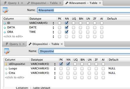 En el segundo "tablas" son los diversos estudios que se han registrado con la fecha y hora. El ID se utiliza para identificar los diferentes dispositivos en su hogar. Para la creación de las varias "tablas" sólo abrir una conexión con el MySQL Workbench, a través de "Conexiones de MySQL". Los datos incluidos son aquellos que se han creado en el paso anterior, como nombre de usuario y contraseña. La dirección IP también puede dejar el localhost (127.0.0.1). Entonces abrirá una página donde podemos controlamos nuestra DB. Lo que debemos hacer es seleccionar "crear nuevo esquema" en la parte superior y el nombre de Sistema_allarme. Una vez creado el esquema, podemos crear las "tablas" que es nuestra relación. Para ello, seleccione la esquina inferior derecha "Sistema_allarme" y el botón derecho, seleccione la tabla de"crear". Los próximos pasos se utilizan para introducir los datos que se han divulgado previamente. El único elemento a añadir en este sentido, es insertar idDispositivi como la clave primaria de la relación / tablas de dispositivos. De esta manera no habrá dos dispositivos con el mismo identificador.