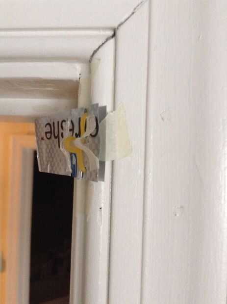 Use un pedazo de cinta adhesiva para sujetar la bisagra en el marco de la puerta. Añadir cualquier cinta adhesiva extra si la paja no es presionado.