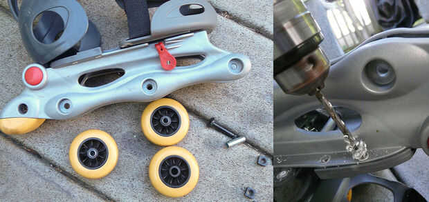 Usando un taladro de poder quitar los remaches de la porción del dedo del pie de la raya.