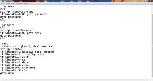 : contraseña cls set /p entrada = contraseña: si % de % entrada == 0000 goto menu goto contraseña cls