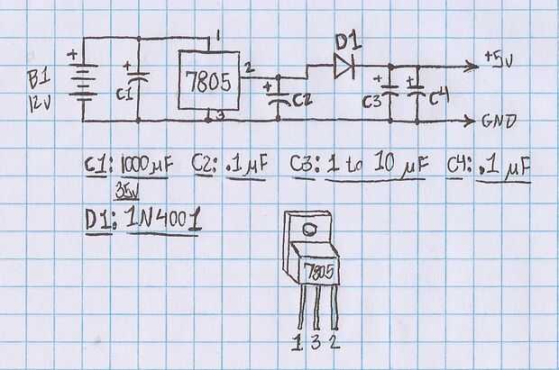 de todos modos, el esquema para el regulador está en el primer cuadro. Tiene un dibujo del regulador y sus pernos. El pin 1 es el voltaje en el pin 3 es tierra y pin 2 es 5 volts hacia fuera.