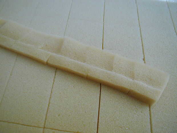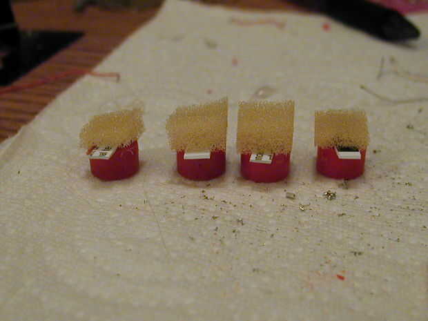 Ya que no puedo usar los interruptores de tacto "fofo" en mi controlador, quería añadir algún relleno para podrían pulsen los botones un poco sin realmente presionar el interruptor del tacto. Encontré una vieja hoja de la espuma que va encima de su colchón y cortar algunos de eso. Pegué a la parte inferior de los botones.
