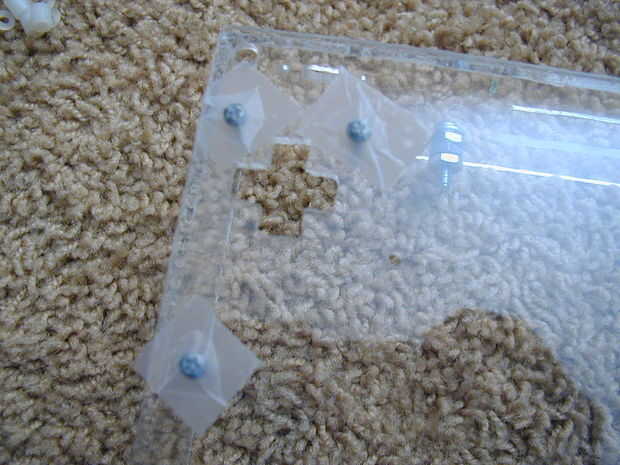Haz tus tres tornillos y ponerlos a través de los orificios en el caso. Cinta adhesiva hacia abajo para no caerse cuando voltee el caso.