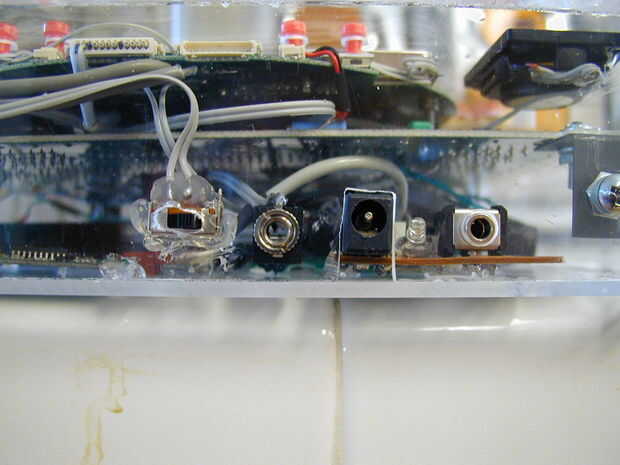 Todo pegado en su lugar, usted necesita hacer los agujeros para el A / V y la carga de los puertos. Necesita fijar el panel trasero sobre el caso y ver dónde están los puertos. Utilizando un archivo (o la Dremel), corte un agujero cuadrado lo suficientemente grande para el puerto de carga. Entonces debes hacer un agujero para el A / V puerto de salida. Es un poco difícil hacerlo con precisión, pero lo mejor que puede. Echa un vistazo a fotos siete y ocho.