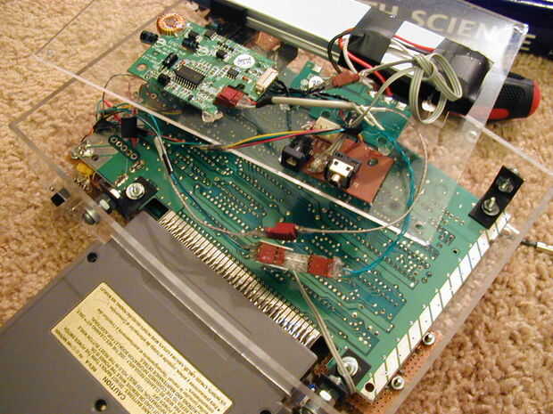 Sencillamente, en este paso pegue todo lo demás (carga de las baterías, circuito, A / Junta de V) a la pieza de fondo del caso. Pegar las baterías en el centro, porque son las más pesadas. Desea que su portátil esté equilibrada. Usé seis pequeñas gotas de pegamento caliente para mantener la batería. Pegué el cuadro de protección corta de batería hacia abajo y el circuito de protección de carga. Pegué el A / V en la parte inferior, justo en el borde del tablero. Ver el cuadro para la instalación de encolado y ver 2 para un primer plano con todos los cables. También necesitará pegamento abajo regulador de NES. Me pareció que el lugar más conveniente para ponerlo en la esquina de la Junta NES. Primero pegué abajo un pedazo de cartón, a continuación, la Junta Directiva. Revisa el cuadro 3.