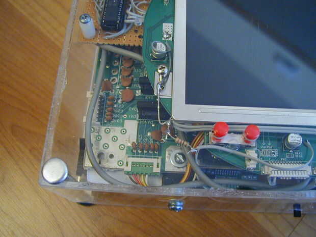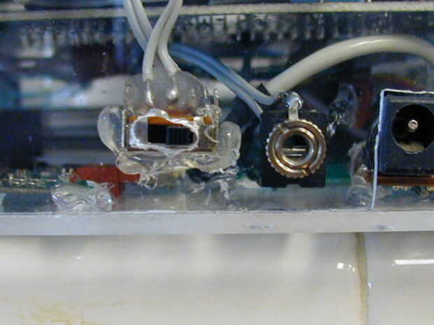 Cuadro 3: El interruptor (con demasiado pegamento caliente) enciende el brillo de la pantalla PSone mod.
