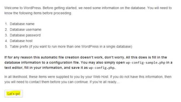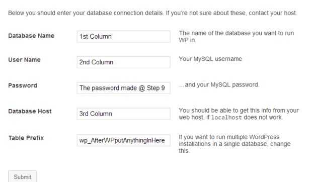 En el explorador web, vaya a su sitio Web. Se le mostrará una página que indica que hay que hacer un archivo de configuración. Ignore todos los errores y continuar. ¿Recuerde que la base de datos MySQL, nombre de usuario y contraseña? sí, necesitaremos otra vez. La foto con los campos y los números es donde tienes que mirar la tabla. (Por ejemplo, si un campo dice 3ª columna, entonces en la base de datos MySQL, ir a la lista de actuales bases de datos MySQL y los usuarios y encontrar la tercera columna. Utilice la información allí para llenar el campo).