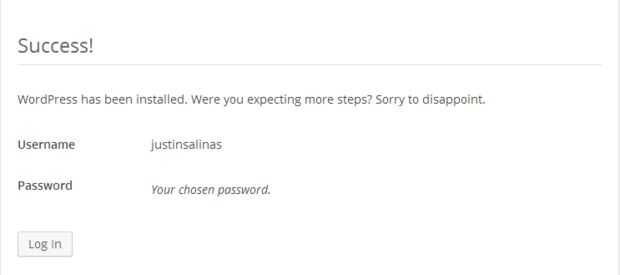 Cuando haya terminado, verá una pantalla con tu nombre de usuario. Haga clic en iniciar sesión y... Tienes tu propio sitio web! ¡ Yay! Usted correctamente había instalado WordPress en tu propio. Eso es bastante!