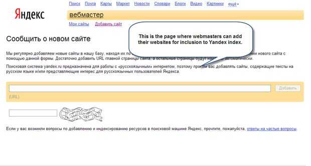 Ir a http://webmaster.yandex.ru/addurl.xml esta es la página donde puede ingresar la dirección URL de su sitio de Internet para conseguirlo indexado por Yandex.