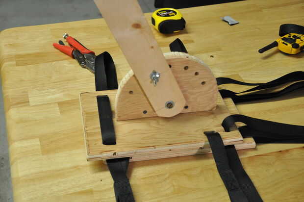 Perfore agujeros en las intersecciones de los rayos y el radio 3", así como el centro (Foto 5). Utilizar cualquier tamaño de bits quieren montar el hardware que está utilizando. Usé 5/16" para los orificios radiales y 1/4" para el centro. Ahora corte a lo largo de la línea 4" radio y corte hacia afuera del tablero (foto 6). A continuación, cortar 2 triángulos de la derecha de 3/4 capas. Los lados cortos deben ser 3" de largo. les Atornille la pieza que usted sólo recortar 2" desde cada extremo de la misma (cuadro 7). A continuación, atornille los triángulos y el pedazo del hombro en la placa del pecho 1 pulgada desde la parte superior con el pedazo de hombro centrado en (cuadro 8).
