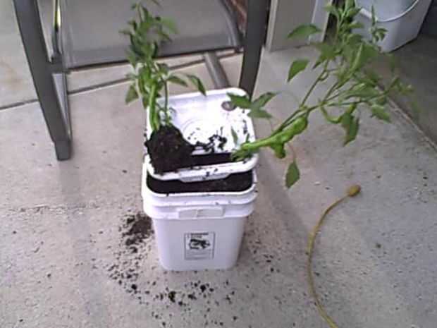 Aquí está la parte difícil... Levante la tapa hasta los tallos para obtener su mano dentro de la cubeta y presione suavemente el cepellón de la plántula en el encapsulamiento mezclar y cubrir suavemente la planta. Compacta la mezcla para macetas alrededor de la base de la planta ligeramente para apoyar el pie de la planta.