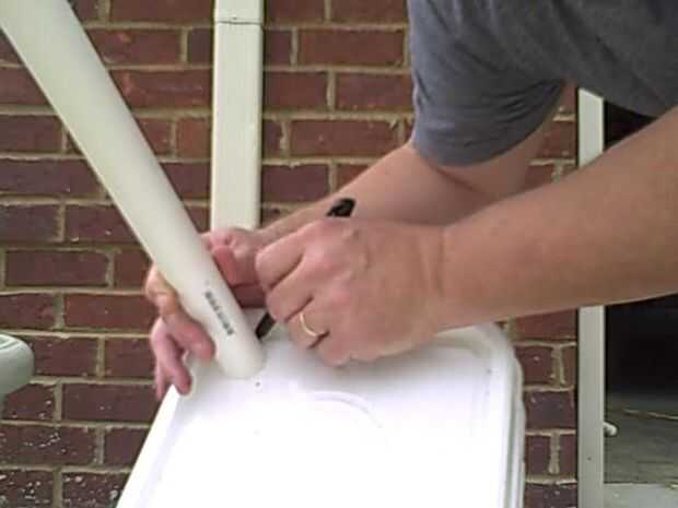 Sólo tiene que utilizar su magia marcador para trazar alrededor de la tubería y luego usar esto para una guía para cortar un agujero para el tubo de riego a residir. Utilice su cuchillo (o puede utilizar un taladro) y cortar un agujero en la esquina de la tapa que se coincida con el tubo corto. Es más fácil de la tapa en el cubo antes de que usted corte el orificio de la esquina.