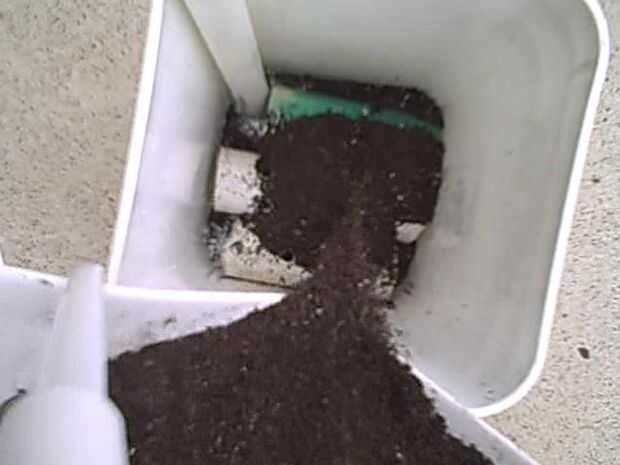La segunda foto muestra vertiendo la mezcla de rellenado en el cubo un poco a la vez... Vierta aproximadamente 1/4 de la mezcla en la cubeta y asegúrese de que llena el otro espacio en la esquina donde se arregla el PVC corto.