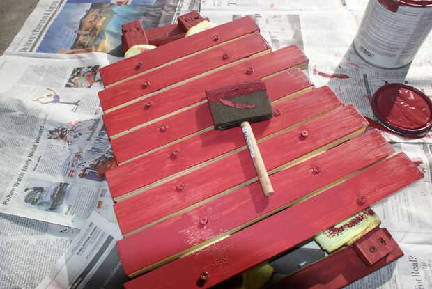 Luego utilizamos una pintura de la casa roja oscura a color las teclas, pero realmente no importa qué tipo de pintura utilizas. Hicimos 2 capas pintura para asegurarse de que toda la madera estaba cubierta.