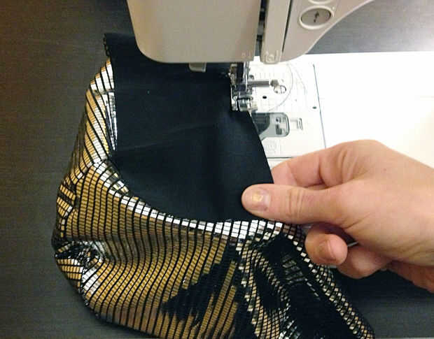 Primero se cose las piezas de cada tejido juntos. Coser los lados del rectángulo central, alinear en la parte delantera del sombrero y trabajando para ambas costuras (importantes para asegurarse de que el rectángulo central no va oblicuamente).