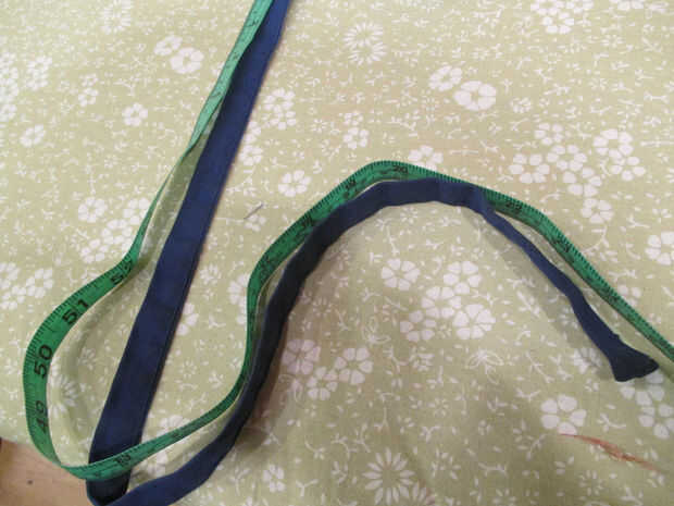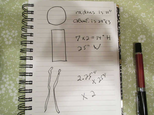 La banda es (7" doblado encima) 14" x 25" y cada lazo es 2,25" x 25". Los lazos (y la bufanda) voy a hacer de tela negra.