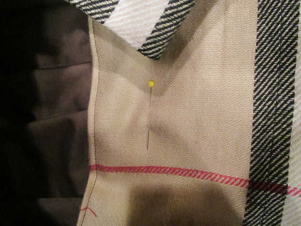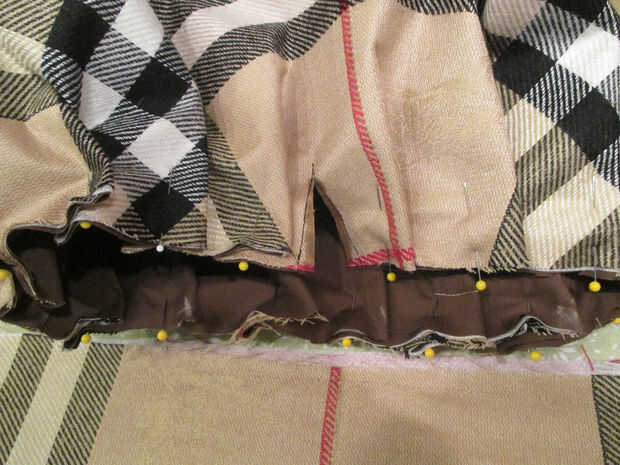 2. coser el frente de la banda círculo de sombrero, a partir de Raja (doblez bajo para disimular el borde crudo), los bordes incluso. Inicio 1/2 en banda, para permitir la superposición de velcro. Comenzar cosiendo poco a poco, quitando los pernos cuando se les acercan. Margen de costura debe ser de 3/8", no más de 1/2".
