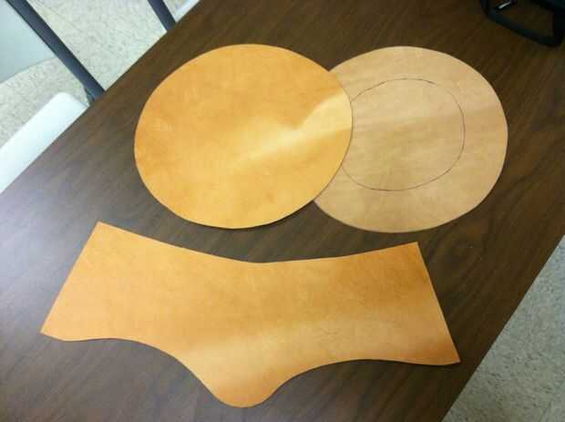 Había ya pensé que sólo tendría la parte superior de la pieza que cortar fuera del centro del borde pero como estuve cortando el patrón hacia fuera decidió que quería la parte superior para ser circular en vez de ovular. Hice un compás rápido improvisados para dibujar hacia fuera. También me di cuenta de que debe ser más pequeño de lo que pensaba originalmente. Todavía lo corte de eso pedazo de centro para no perder más cuero.
