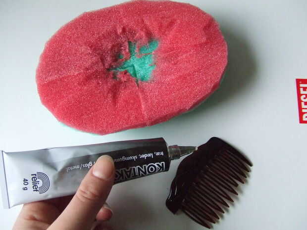 Hacer una depresión en la parte inferior del sombrero y sujete la horquilla usando pegamento.