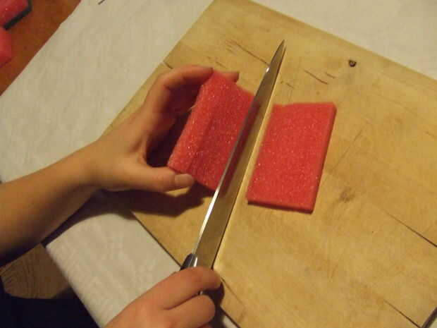 Cortar las esponjas rosa a lo largo de la cara. Ahora tiene cuatro piezas delgadas.