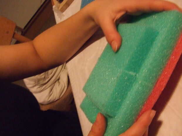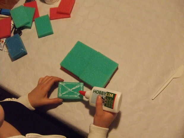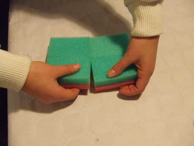 Unir cuatro piezas rosa con cuatro de las esponjas verdes. Ahora tienes cuatro esponjas verdes con fondo rosa. Unir las cuatro esponjas verde/color de rosa para que tengas una plaza. Pegue dos esponjas verdes en la parte superior de la Plaza.