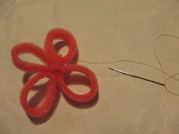 Tomar una pieza y coser juntos para que tenga un círculo. Hacerlo mismo con otros tres y coserlas juntas por lo que parece una flor.