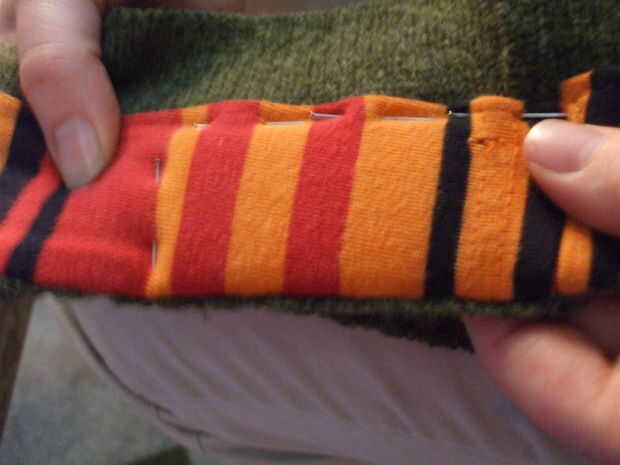 Coser el forro a la banda en el extremo del auricular, dejando espacio para la toma de salida del bolsillo en el interior de la banda.