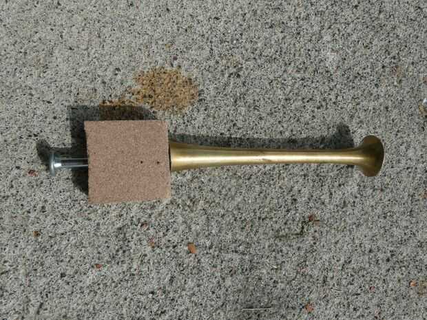 Cortó el cuello de un viejo florero bud de latón. Usé una amoladora para cortar a través del cuello. * insertar aviso * este proyecto utiliza ángulo Rectificadoras, soldadura de hierros y otras cosas cortantes o puntiagudos. Siempre tenga cuidado y use el equipo de seguridad adecuado. Cortar unas maderas de desecho en un bloque con una sierra de banda y atornillar el bloque a la chimenea. El perno fue demasiado largo así que de nuevo a la amoladora para cortar la parte sobrante. Luego, medí una plantilla de papel para cubrir el bloque de madera. Después el ajuste derecho que trazó la plantilla sobre algunos hoja de cobre amarillo fina, recortar con tijeras. También corte un protector de calor para poner detrás de la chimenea.