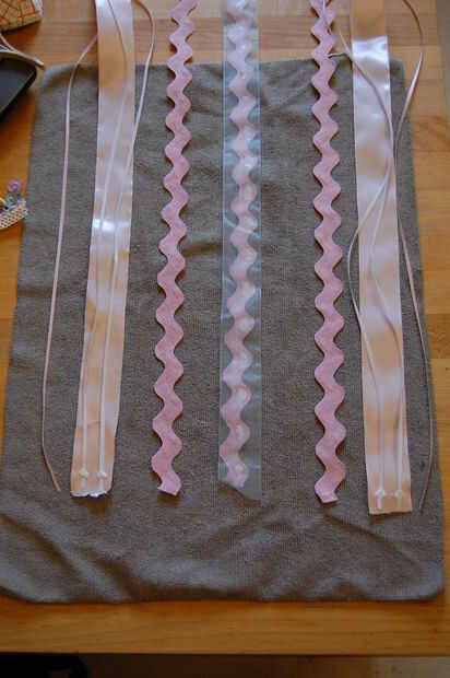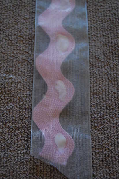 Para añadir algo de interés para el arte pongo algunos rick rack sobre un escarpado de la cinta. Pegué cada otra onda para crear algunos bolsillos para colocar los clips de pelo. También pegué cinta delgada frente a pura por cable de la cinta, para añadir más dimensión a la nave. (Cuando he probado el proyecto terminado, los clips de pelo no sostienen bien la cinta delgada. Era demasiado resbaladizo).