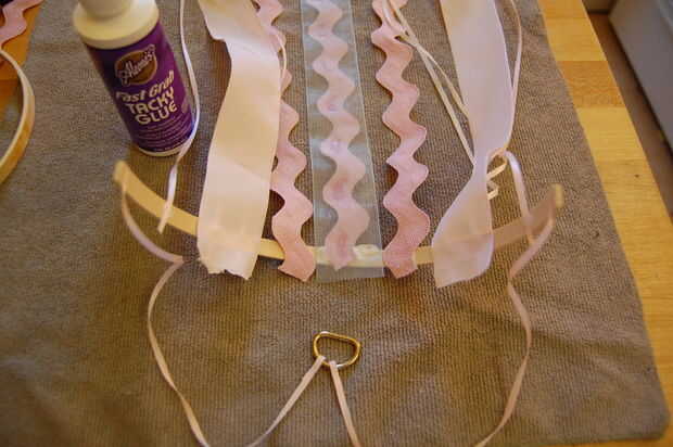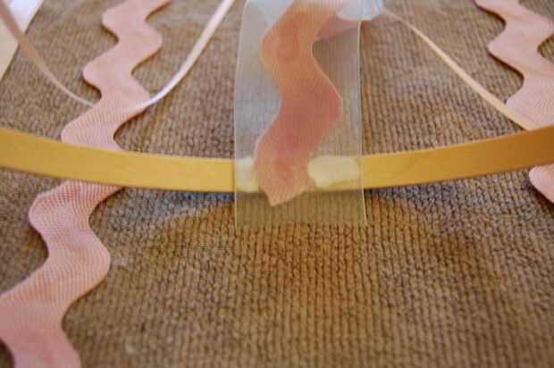 Luego pegué las cintas en el interior del aro exterior medio (el mismo pega ya las cintas utilizadas para colgar el arte). Sugiero a partir de la media (comentar, pero se puede medir Si tienes a) y de trabajo hacia fuera de allí. Si se pega la cinta con algún exceso colgando la parte superior, esto está muy bien, puede ser recortado posteriormente.